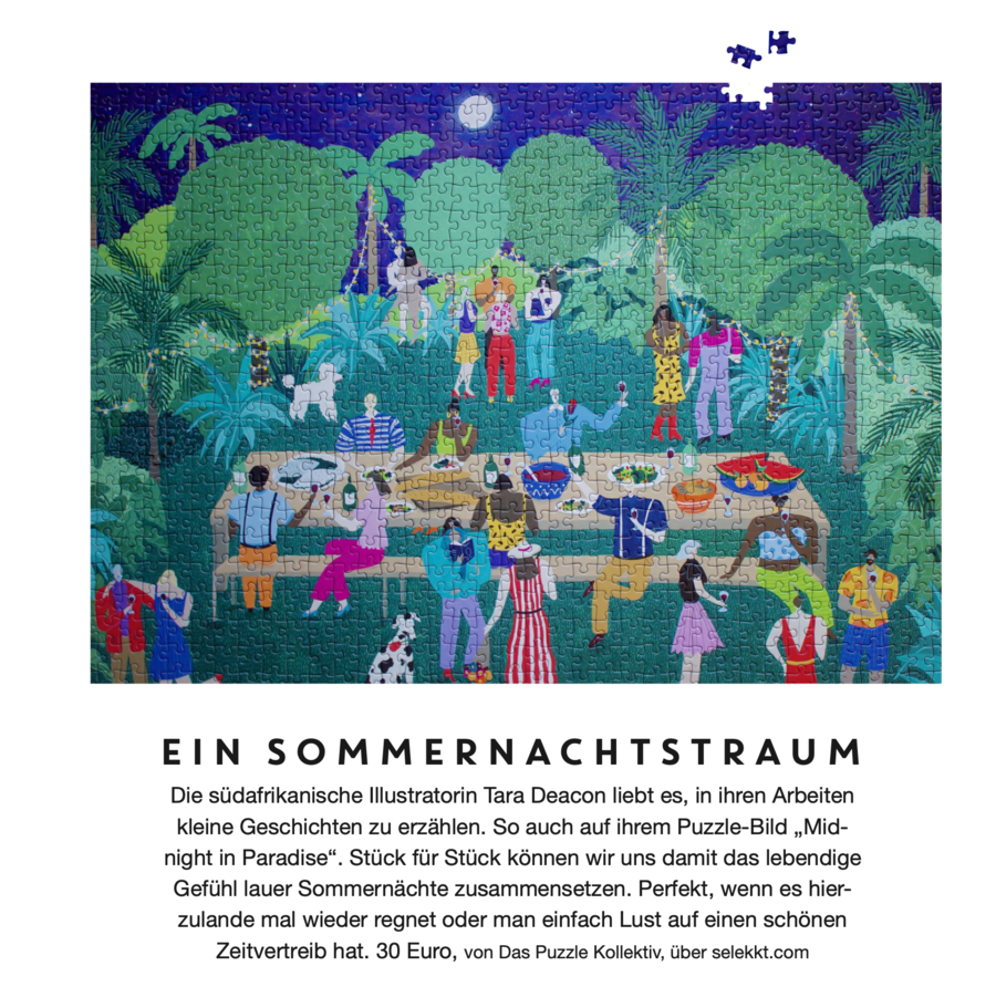 FLOW Häppchen: Kleien Inspirationen, tolle Adressen, Bücher & mehr: Die südafrikanische Illustratorin Tara Deacon liebt es, in ihren Arbeiten kleine Geschichten zu erzählen. So auch auf ihrem Puzzle-Bild „Mid- night in Paradise“. Stück für Stück können wir uns damit das lebendige Gefühl lauer Sommernächte zusammensetzen. Perfekt, wenn es hier- zulande mal wieder regnet oder man einfach Lust auf einen schönen Zeitvertreib hat. 30 Euro, von Das Puzzle Kollekti